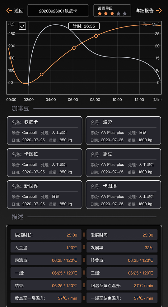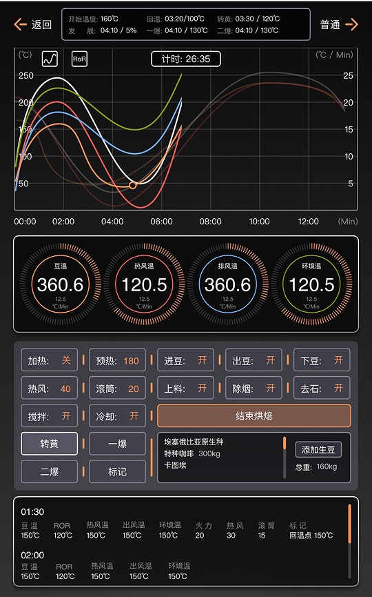 记录烘焙方式,建立一支豆子稳定的烘焙生产线。测量豆温、热风温、排风温、环境温等数据。